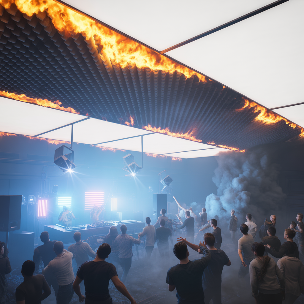 • As faíscas atingiram diretamente o teto, onde havia sido instalada espuma acústica de baixa qualidade e alta inflamabilidade
